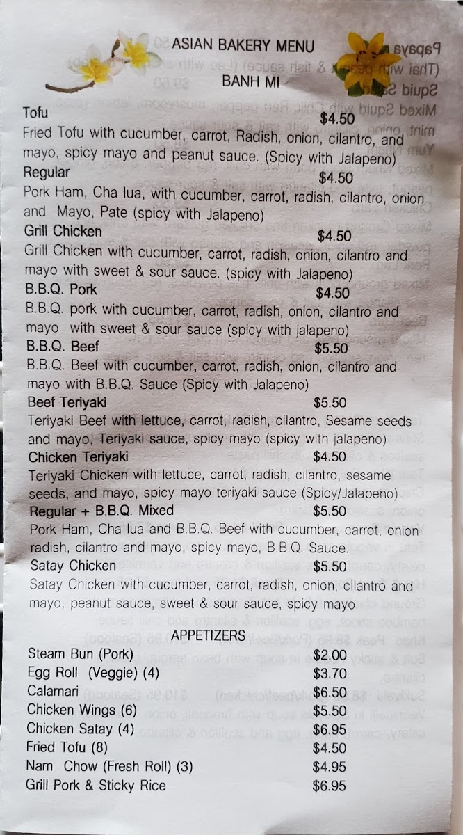 Asian Bakery & Fast Food Menu