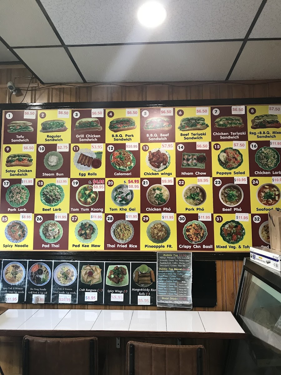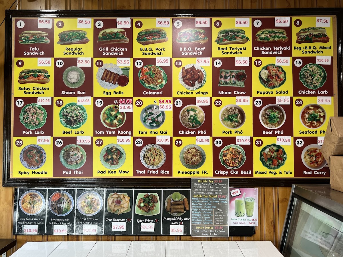 The menu features a variety of Asian and Vietnamese fast food items, organized into several main categories to suit different meal preferences and times of day. Patrons can find classic Vietnamese sandwiches, known as Banh Mi, available with several fillings such as tofu, grilled chicken, and pork ham. These sandwiches are typically served with fresh vegetables and a choice of sauces, including spicy options.